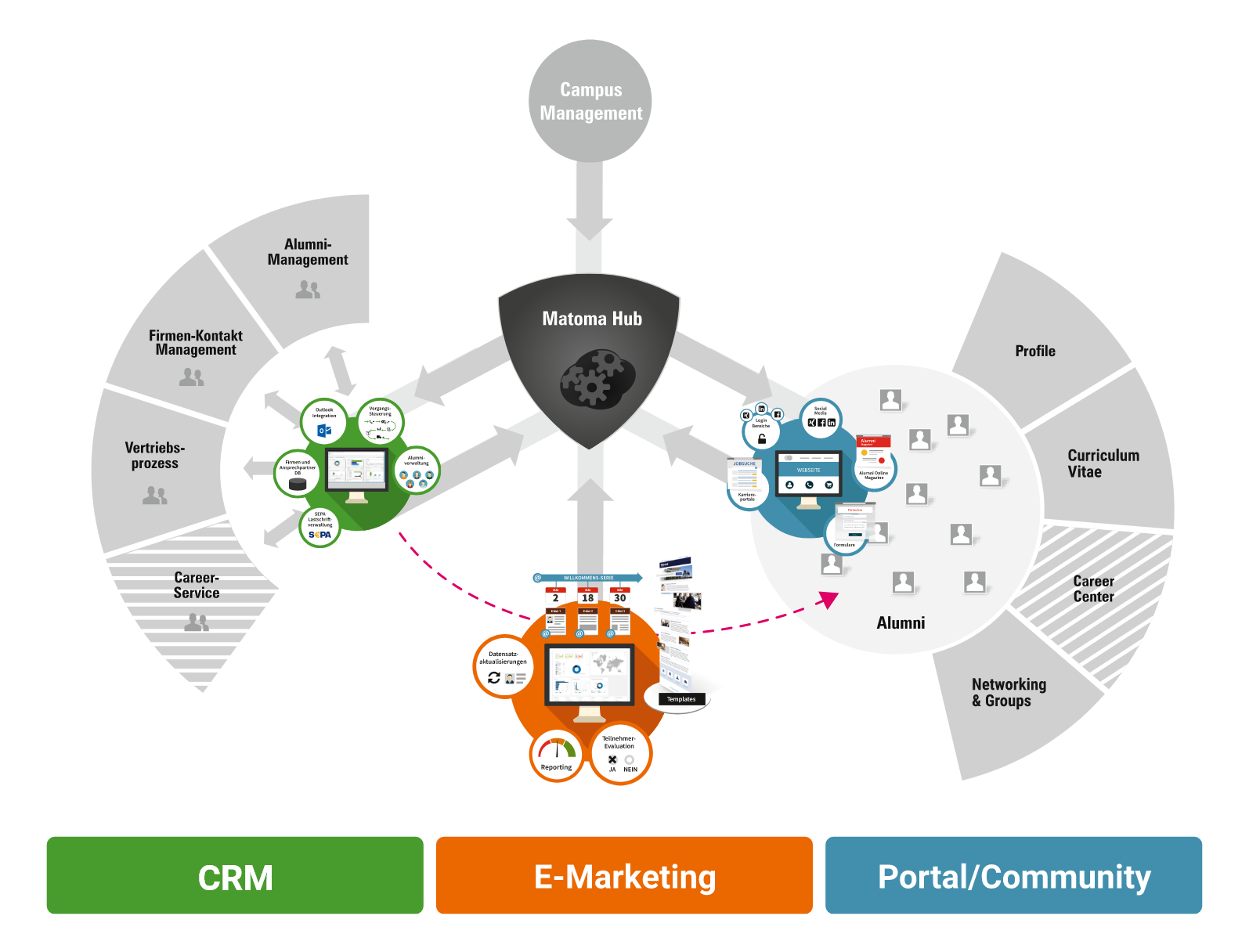 Mais la vision de Gola ne s’arrête pas aux amphithéâtres. Depuis 2010, il allie technologie et travail d’anciens élèves en développant avec Matoma des solutions logicielles sur mesure pour la communication universitaire. Ce réalignement lui a valu comme clients des universités de toute la région germanophone.